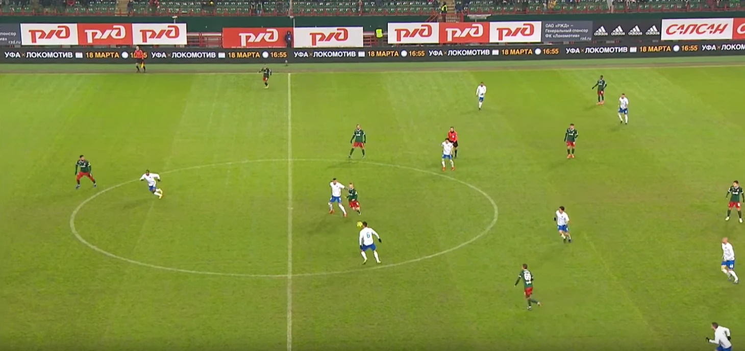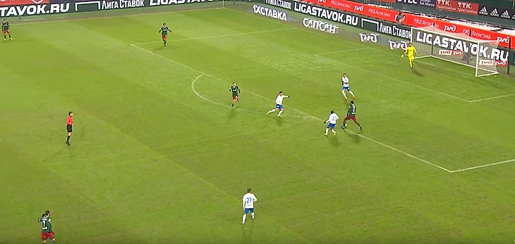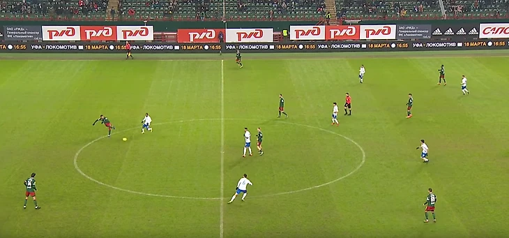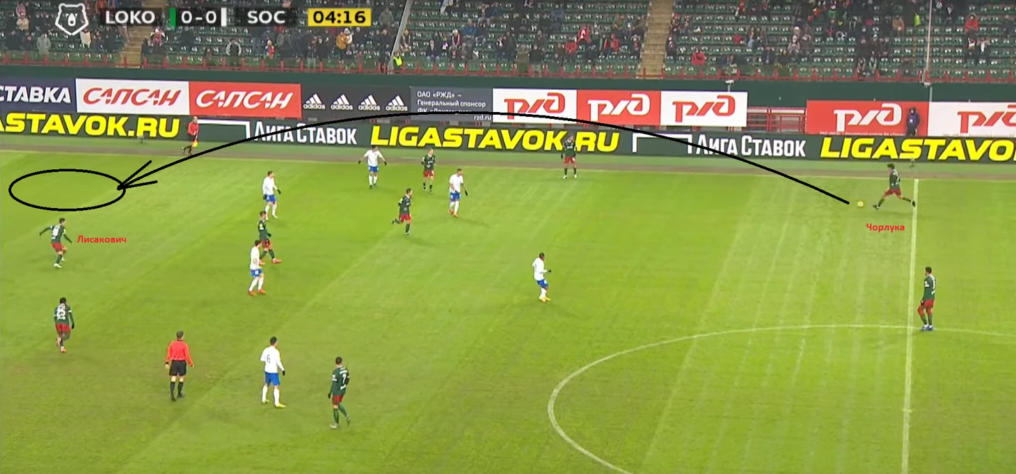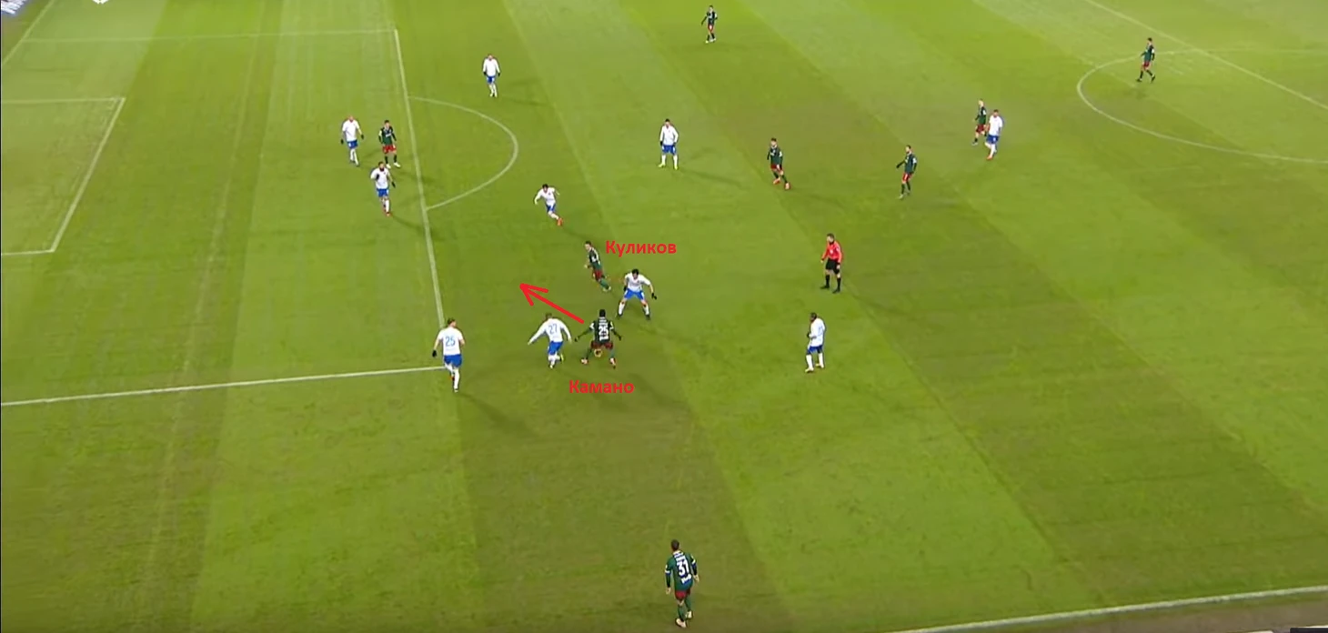 Понравилось как «Локо» с самого начала игры взял мяч под свой контроль, с целью выманить соперника в высокий прессинг. В образующиеся свободные зоны врывались быстрые игроки группы атаки — троица Камано-Лисакович-Жемалетдинов, а так же активно подключавшийся Куликов. Продвижение мяча вперед, как правило, происходило через серию коротких передач по правому флангу (47% процентов атак «Локо» провел этим флангом), где неплохо комбинировали вышеназванные Куликов и Лисакович, а так же Дмитрий Рыбчинский, либо с помощью классных проникающих передач Ведрана Чорлуки. Благо за спину защитникам открываться было кому.