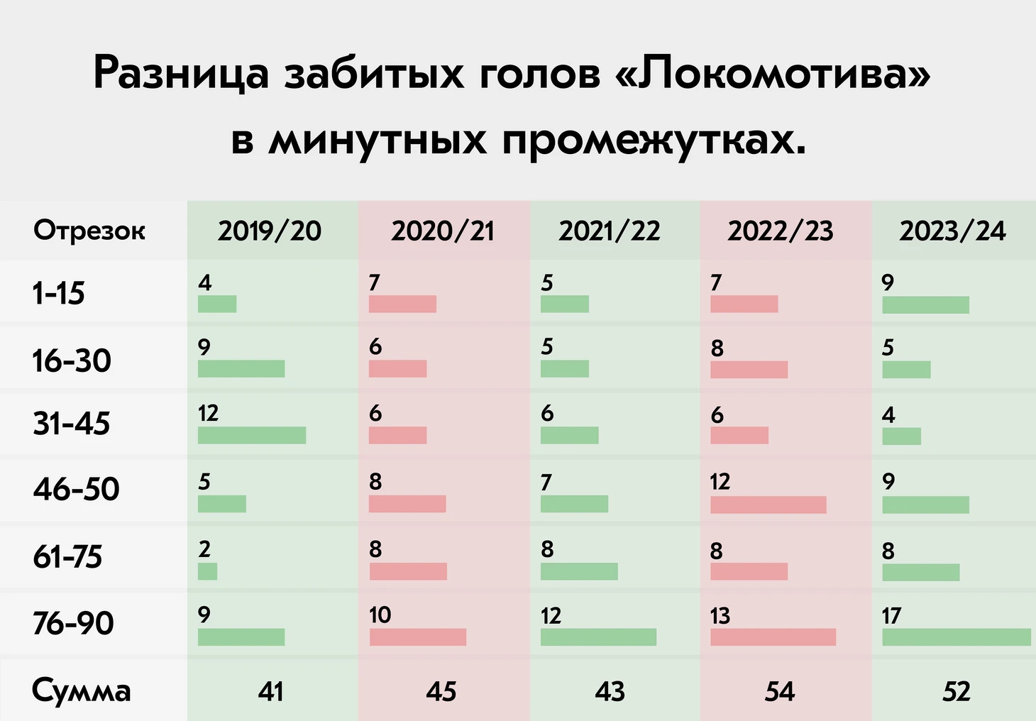 Этот сезон не единственный, когда «Локомотив» забивал в концовке игры, за исключением лишь в двух из пяти последних сезонов, в 2019/20 и 2022/23 годах. Обнаружил, что начиная с сезона 2019/2020 именно «Зенит» являлся королями последних минут, занимая первое место в последних 15 минут матча, лишь единожды превзойдя «Локомотив» по забитым мячам — 20 в прошлом сезоне.