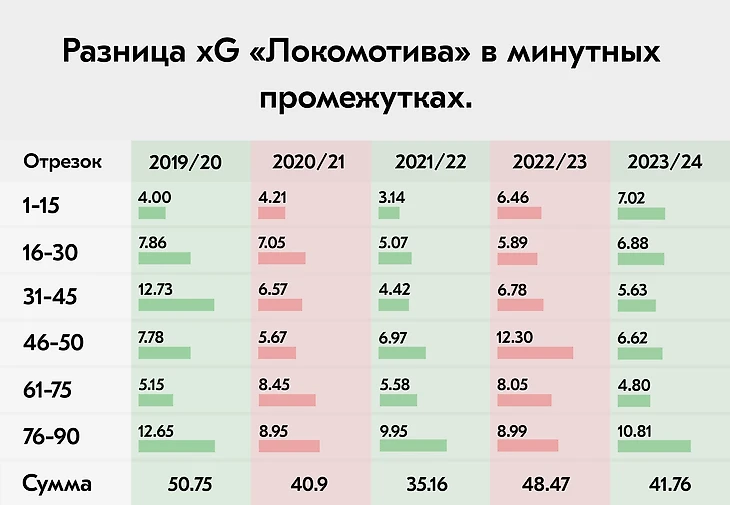 В этом сезоне команда Галактионова забила на десять мячей больше ожидаемого, при этом шесть из которых — в концовках, три в промежутке середины второго тайма, а вот в начале первого тайма наоборот — разница фактических и ожидаемых голов в пользу xG, где «Локомотив» недосчитался двух мячей.