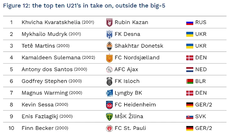 На втором месте по обводке за пределами пяти лучших лиг оказался игрок «Шахтера» Михаил Мудрик, выступающий в аренде в «Десне». «Наверняка вскоре он получит шанс вернуться в клуб, которому принадлежит», — считают эксперты CIES. Примечательно, что топ-3 закрывает еще один «горняк» Тете.
