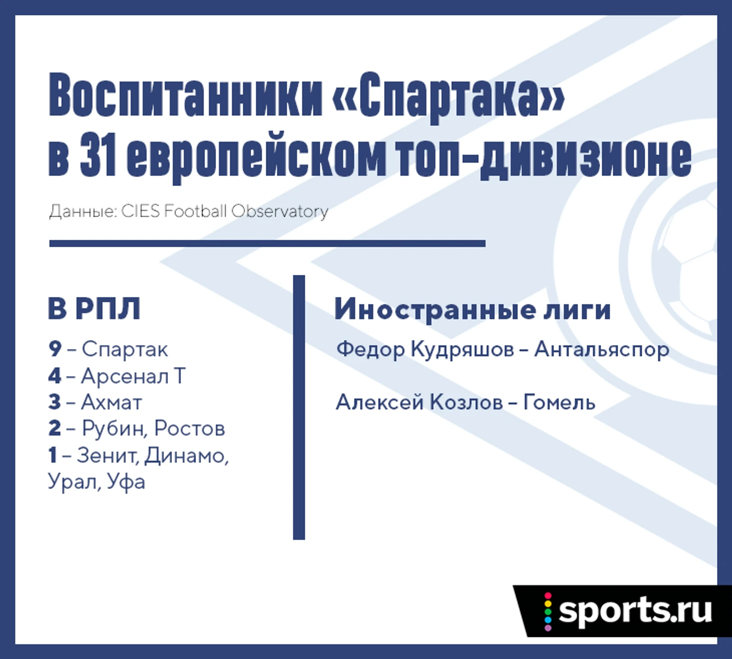 По подсчетам CIES, у «Спартака» на поле появляются 9 воспитанников собственной академии. Всего спартаковцы выступают за 13 из 16 клубов РПЛ – это рекорд (совместно с «Зенитом»). Один из двух футболистов, уехавших за границу, по традиции играет в Беларуси.