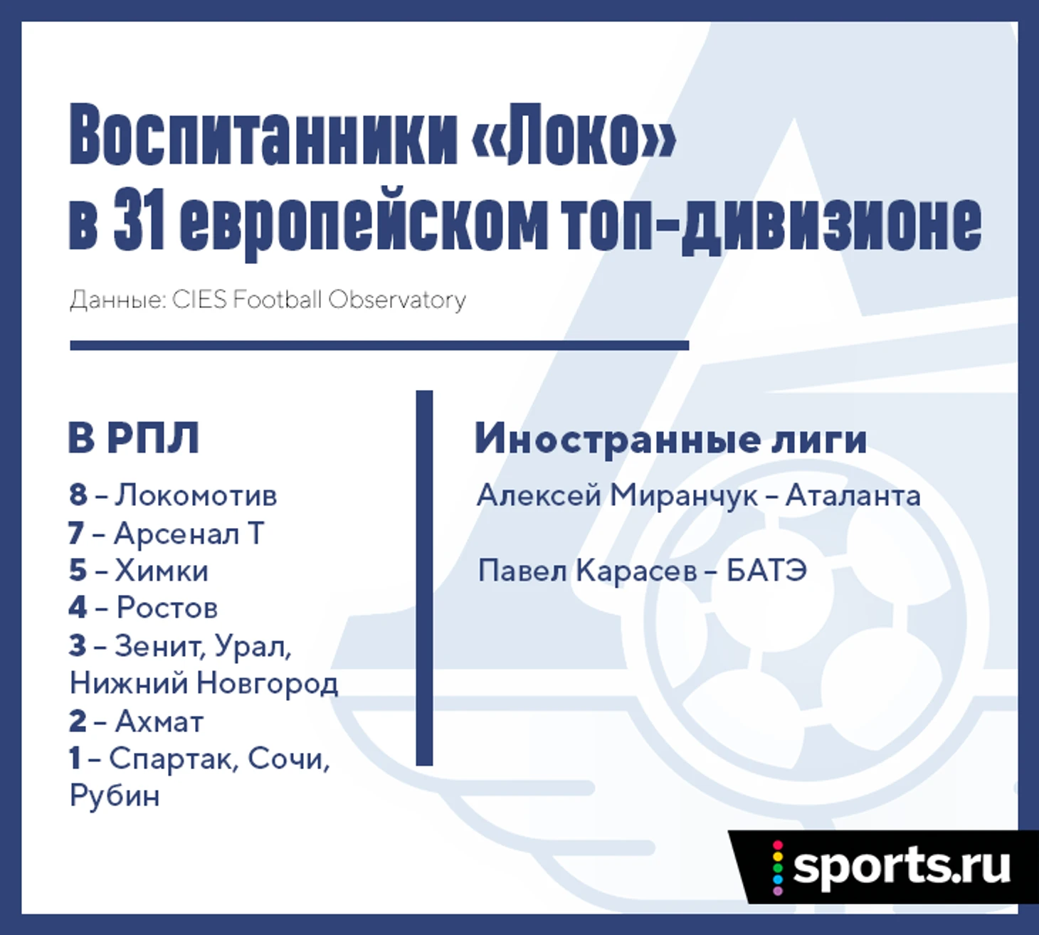 Показатели российских клубов скромнее, хотя цифры тоже впечатляют. Как и в прошлом году, лучшим из наших стал «Локомотив». Клуб воспитал 40 игроков элитных дивизионов, это 25-е место в Европе. Дальше расположились «Зенит» с 31 воспитанником и «Спартак» с 26.