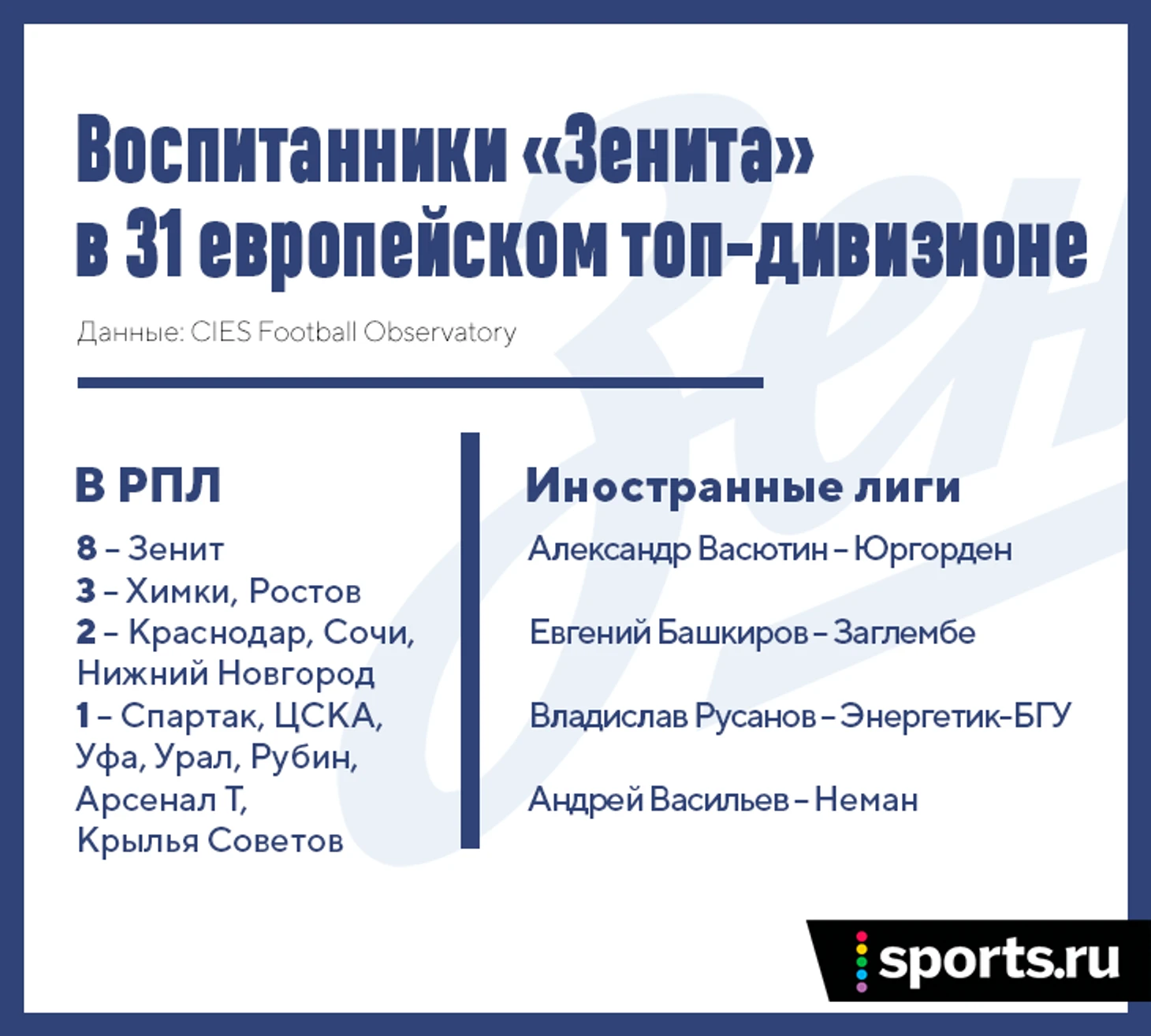После академии «Зенита» чуть чаще, чем после школ других клубов РПЛ, уезжают за границу. Таких игроков четверо – едва ли можно говорить о какой-то тенденции. Двое зенитовцев в Беларуси – традиционная история про футболистов, не сумевших заиграть в России (или предпочитающих бороться за медали в более слабой лиге вместо борьбы за выживание в РПЛ).