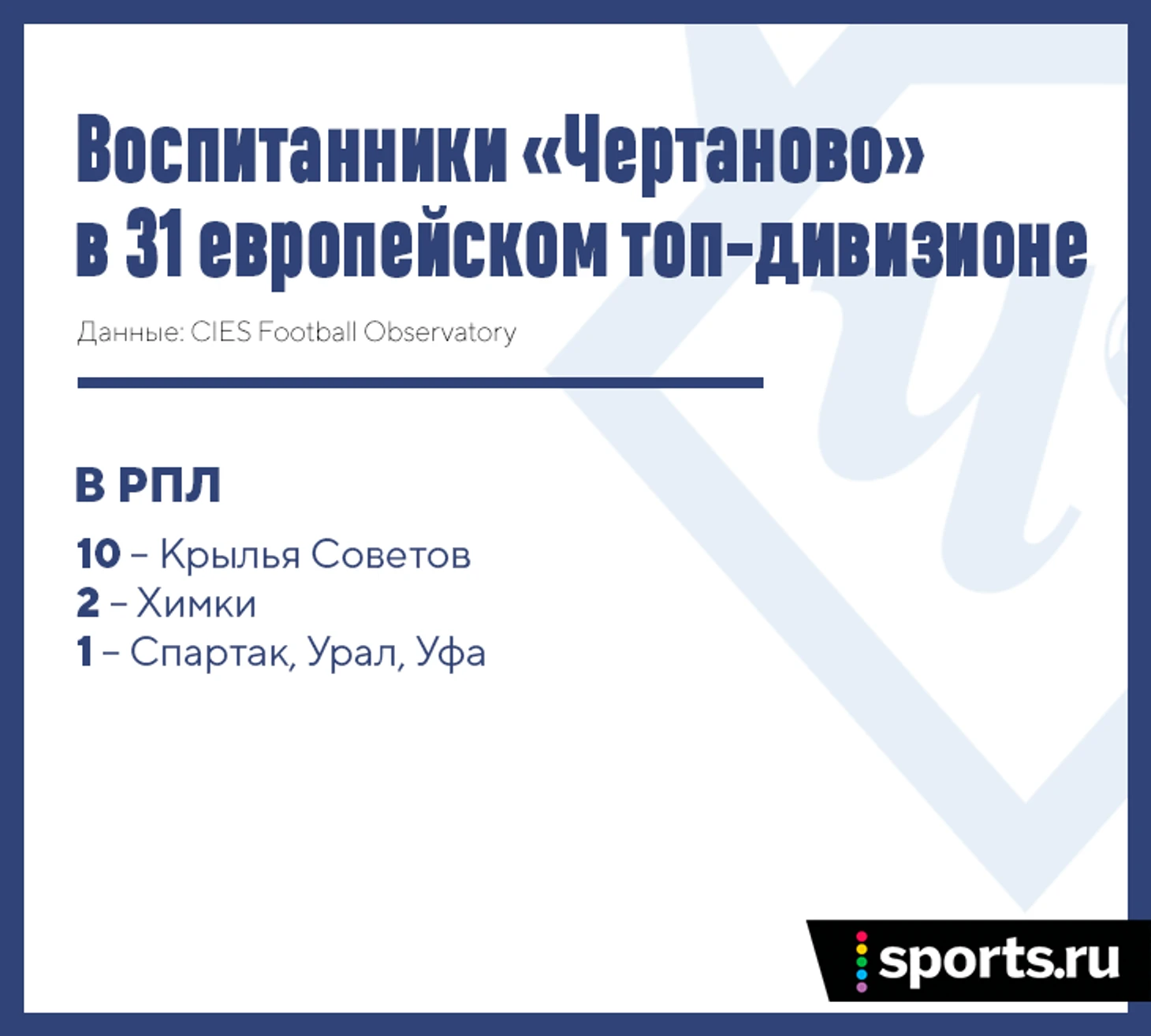 Седьмой по числу воспитанников академией стала школа клуба, который никогда не поднимался в РПЛ – «Чертаново» (15 футболистов). Решающую роль в этом сыграл выход в элиту самарских «Крыльев», чей состав напичкан выпускниками этой московской школы – 10 игроков!