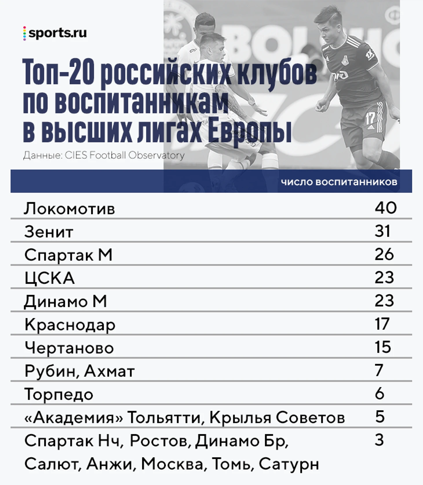 Во внутрироссийский топ-5 также попали московское «Динамо» и ЦСКА – по 23 выпускника.
