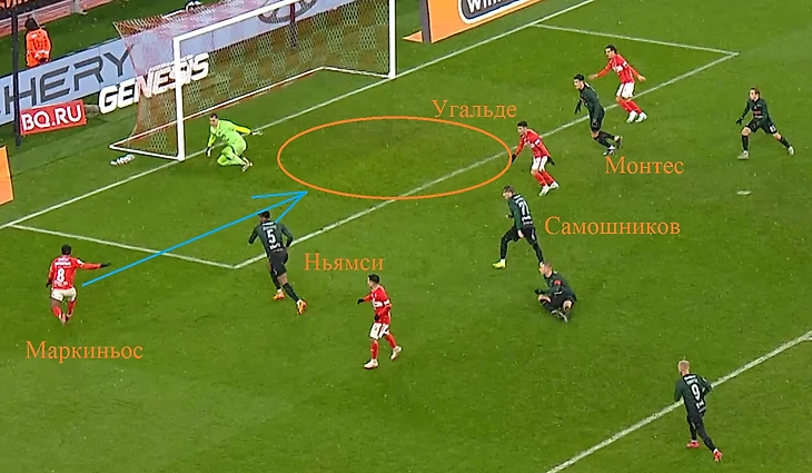 На 74й минуте концентрацию потерял уже Самошников. Они с Ньямси ситуативно поменялись местами и Илья выключился или растерялся немного, оставив много пространства прямо перед воротами и с передачи все того же Маркиньоса Угальде оформил покер.