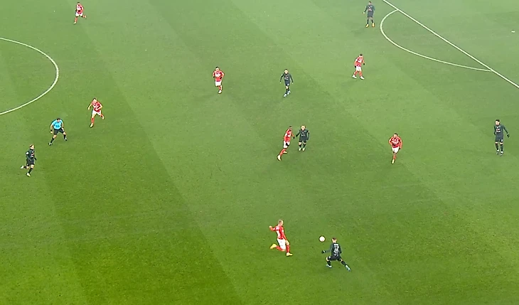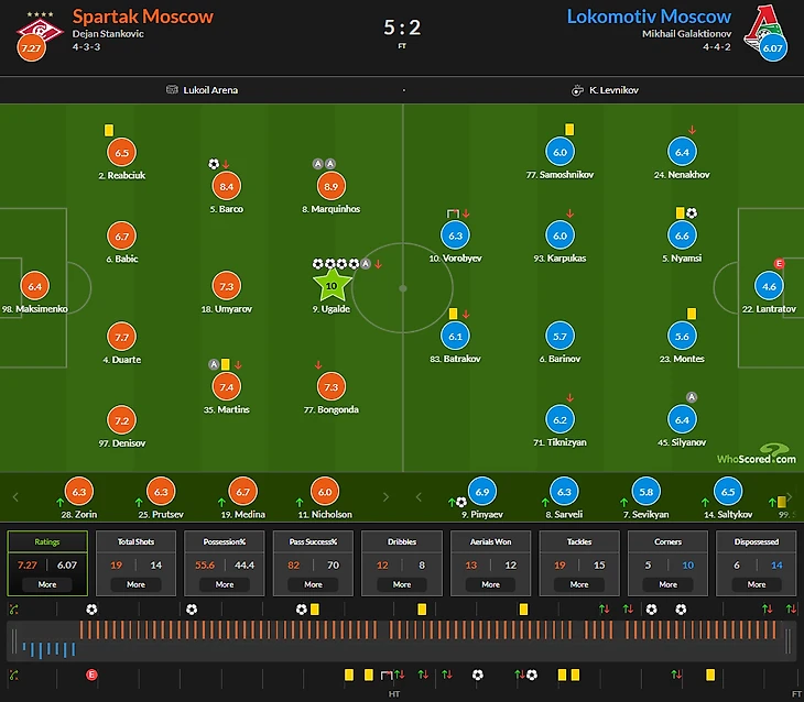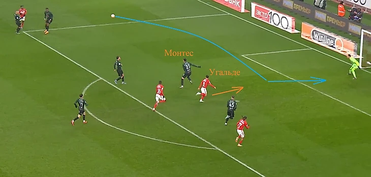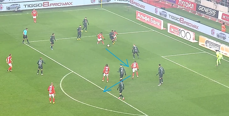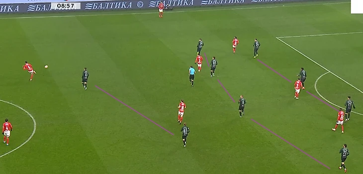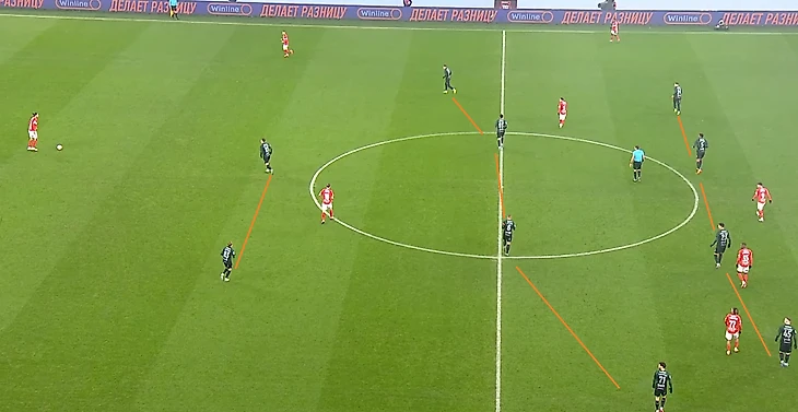 «Спартак», в свою очередь, прессинговал максимально высоко и агрессивно, вынуждая раз за разом гостей выходить из обороны через забросы верхом, которые чаще всего приводили к потере мяча.