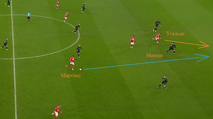 На 30й минуте счет стал 3:0. Монтес с Ньямси упустили Угальде за спину и тот легко разобрался с Лантратовым.