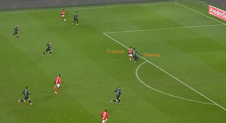 «Спартак» старался использовать своих активных крайков Бонгонду и Маркиньоса на флангах и чуть ближе к центру. Часто искали передачей в полуфланг Угальде и тому, как правило, удавалось цепляться за мяч. А с изменением счета и ошибками гостей умело пользовались свободными зонами.