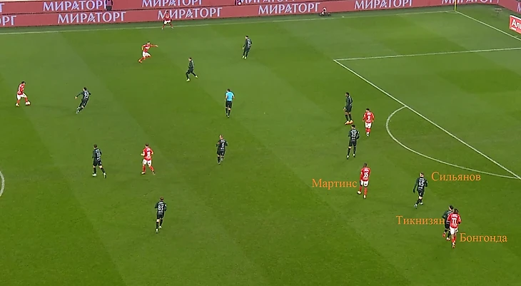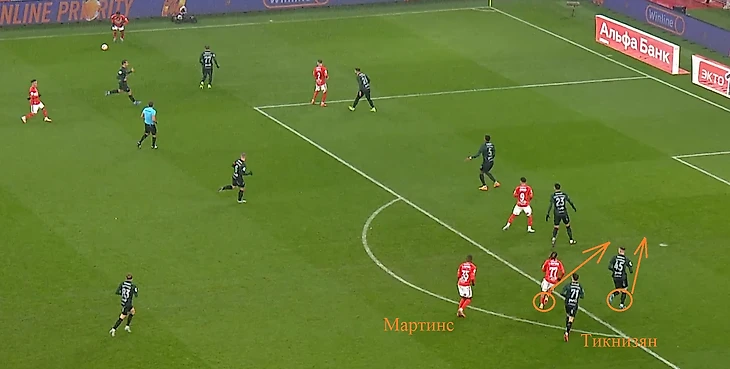На 19й минуте Тикнизян сыграл спустя рукава при опеке Бонгонда, пошла подача с фланга и Сильянов остался один против Тео и Мартинса.