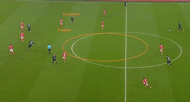 А при позиционной обороне (таких случаев в первом тайме почти не было) на своей половине поля модель красно-белых была похожа на матч против «ЦСКА». Главная цель - перекрыть Батракова, за которым по пятам следовал Умяров. Алексей располагался на той же позиции, что и Обляков в другом московском дерби (на мой взгляд, слишком высоко). Ивана тогда выключили из игры и, таким образом, «ЦСКА» остался без продвижения в атаке. Такая же ситуация получилась и против «Локо». Железнодорожникам явно не хватало дирижера с мячом в опорной зоне.