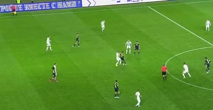 Что же, берём с запасом. Время, когда мяч уже точно отлетел от ноги Норманна и отлетает от ноги соперника Харина. Даже делая стоп-кадр с большим опозданием, после того, как мяча коснулся партнёр Байрамяна, Хорен всё ещё находится в очевидном офсайде. Если вы его не видите – могу только посоветовать сходить к окулисту, а лучше сразу делать операцию на глазах. Но, скорее всего, это не поможет.