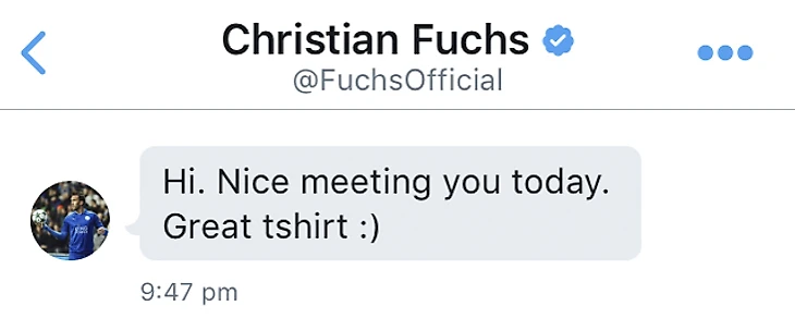 Вторая история – про твиттер. После матча с «Вест Хэмом» в Лондоне пару недель назад мне хватило наглости в микст-зоне поймать Кристиана за рукав и попросить фото для «личного фаната из России». Он тогда очень радовался футболке (той самой, из его модной коллекции), улыбался на фото и желал мне хорошего дня.