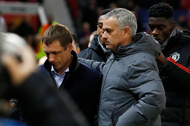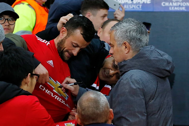 Действующий тренер ЦСКА вышел из подтрибунки в обнимку с Моуринью, который потом еще минуты полторы раздавал автографы у скамейки «МЮ».