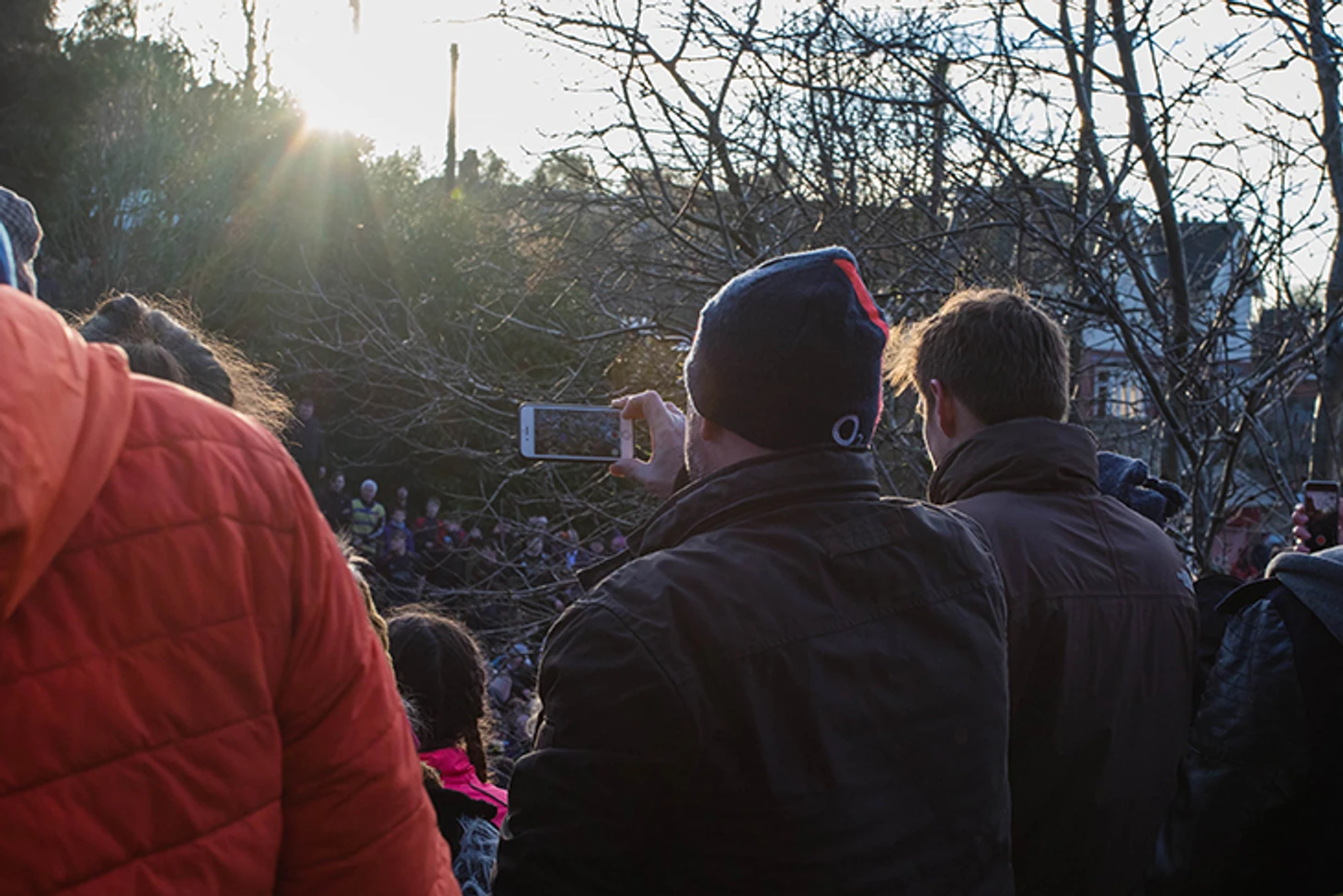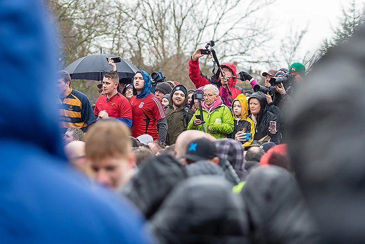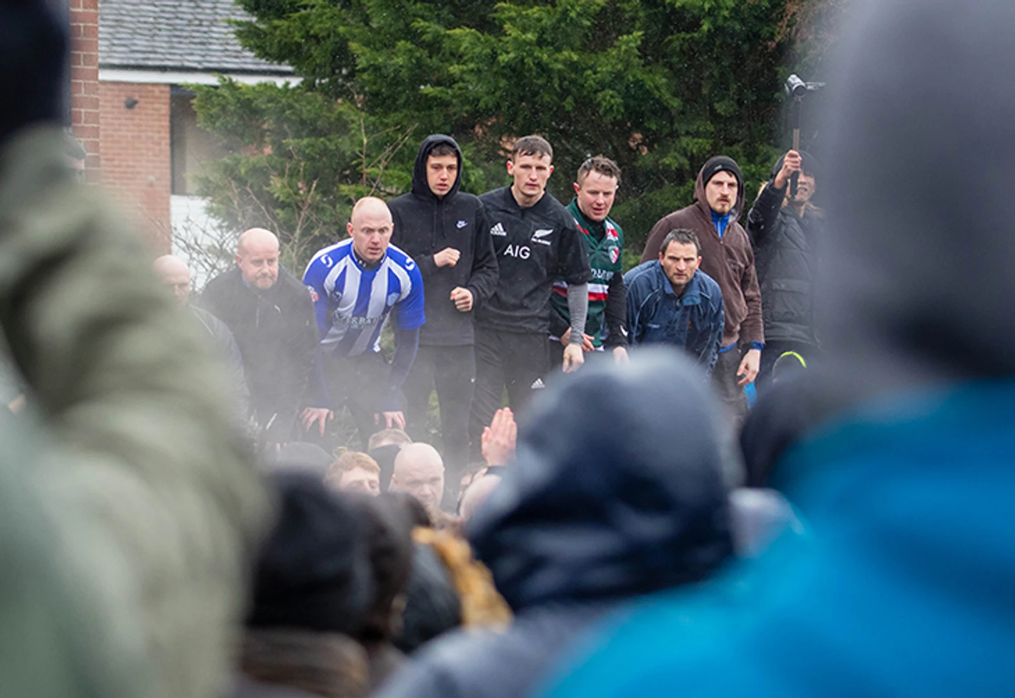 В следующий раз его можно увидеть только через несколько часов: мяч моментально теряется в давке из сотни участников. Больше всего это похоже на хаотичную регбийную схватку: мяч выдергивают из чужих рук, расталкивают друг друга и стараются сдвинуть толпу в нужную сторону. Над эпицентром в морозном воздухе тут же поднимается облако пара, а зрители забираются на ограждения, пытаясь разглядеть хоть что-то. Кто-то снимает происходящее на камеру, другие, срывая голос, подсказывают игрокам направление в сторону чужих ворот.