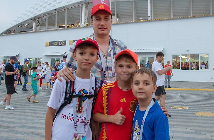 Юные болельщики Даниил, Матвей, Тимофей, взрослые Олег и Дмитрий