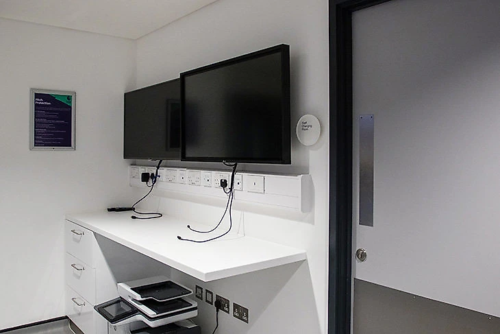 Комната тренерского штаба и экраны, на которые можно вывести моменты игры прямо в перерыве.