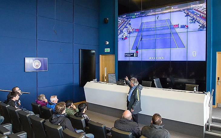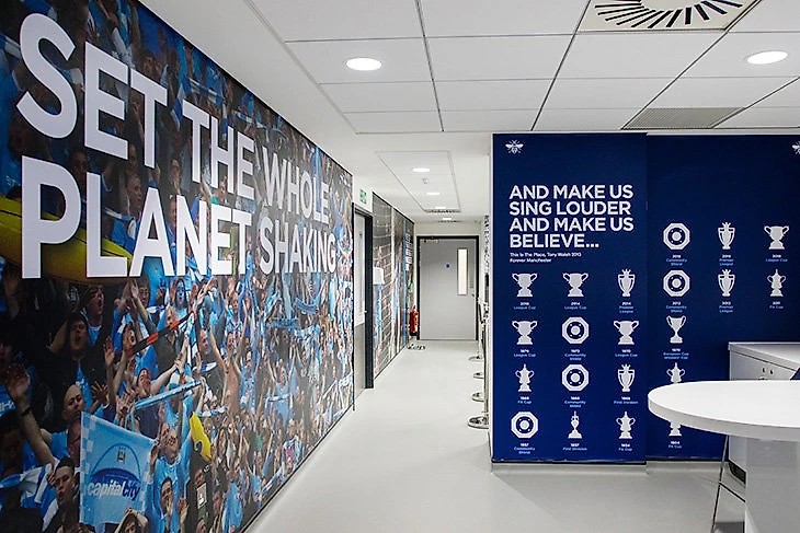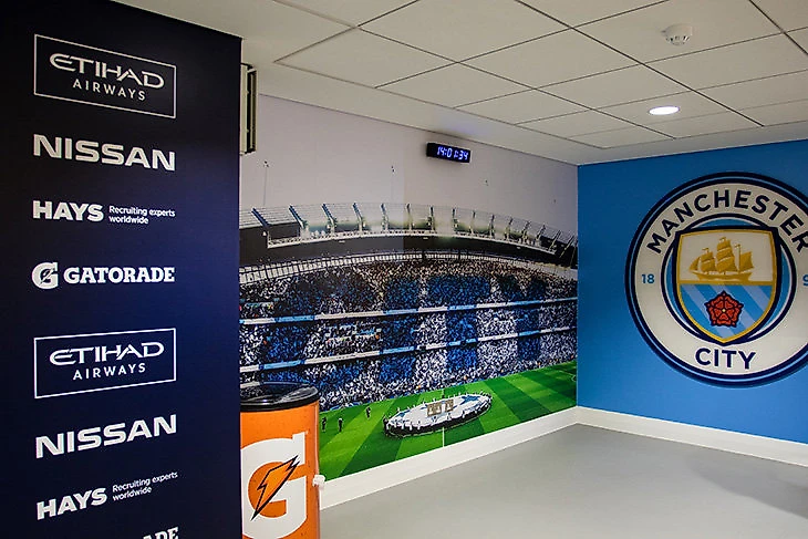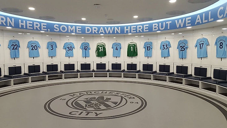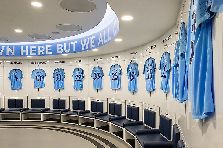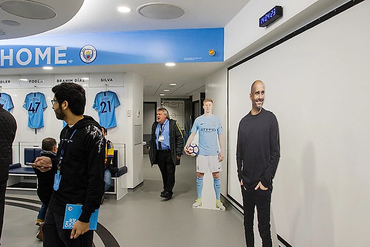Если вы смотрели документальный фильм про «Сити», то заходить сюда будете как к себе домой: игровые футболки по периметру и картонная фигура Гвардиолы у большого экрана.