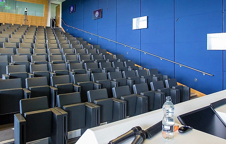 Зал для пресс-конференций вмещает 105 корреспондентов. Рекламные плакаты за спиной главных тренеров меняют раз в пару недель: для разных турниров выкатывают разные спонсорские баннеры.