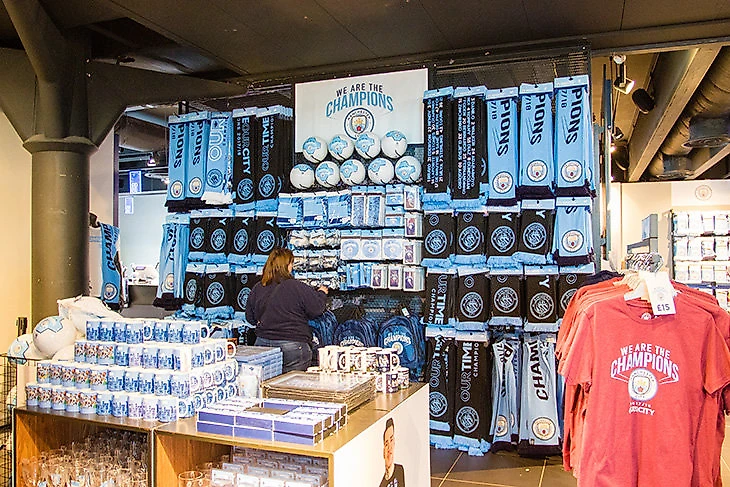 Экскурсия начинается на втором этаже клубного магазина. В самом углу большого зала с игровыми футболками, чемпионской атрибутикой и всеми возможными предметами с логотипом «Сити» (от поилок для собак до детских слюнявчиков) прячется клубный музей.