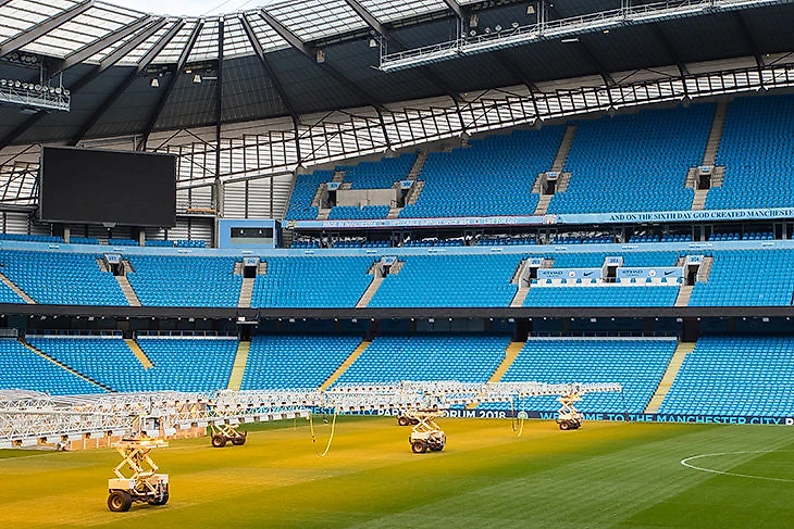 Туристам заходить на газон категорически запрещено, как и всем сотрудникам клуба – кроме агрономов, ухаживающих за травой. У главного ответственного за газон есть дистанционный доступ к системе полива, который он может контролировать даже из отпуска. Однажды, когда Гари Невилл записывал на «Этихад» стендап для Sky Sports, следящий за ним по камерам агроном не удержался – и включил под легендой «Манчестер Юнайтед» разбрызгиватель воды.