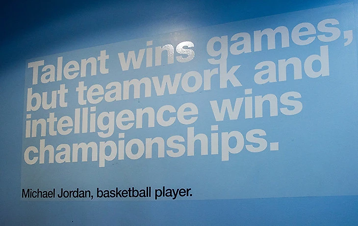 Все настолько скромно, что на музей и красивый ролик про «Сити» уходит всего 10 минут, после чего группу уводят из музея на стадион – мимо цитаты Майкла Джордана. «Талант выигрывает матчи, командная работа и разум выигрывают чемпионаты» – жаль, что Федора Смолова тут вряд ли особенно ждут.