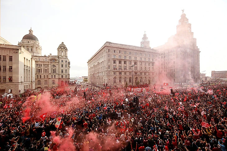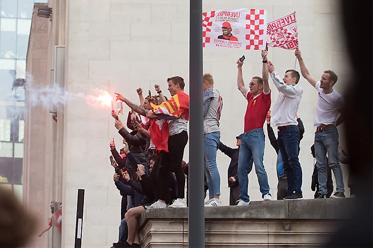Когда автобус подполз к середине улицы, из колонок загремело YNWA, а красный дым пошел из башен Liver Building – здания, которые украшают те же птицы, что и на эмблеме «Ливерпуля».