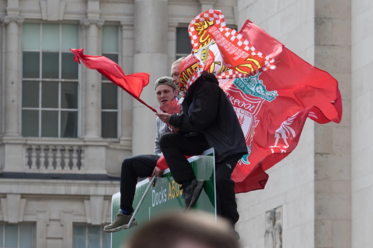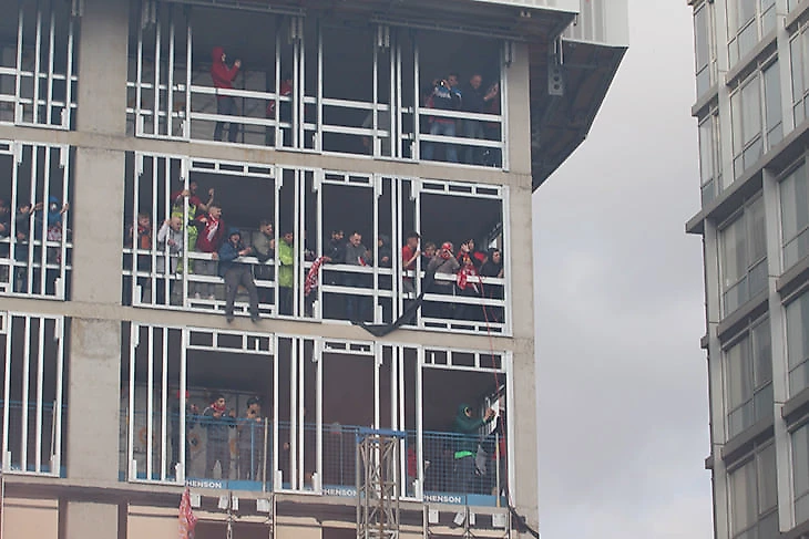 Забудьте любителей, карабкающихся на автобусные остановки и знаки. Фанаты «Ливерпуля» лезли на крыши зданий, припаркованные в доках корабли, а несколько сотен самых отчаянных прорвались на закрытую стройку и заполонили все этажи незаконченного здания.