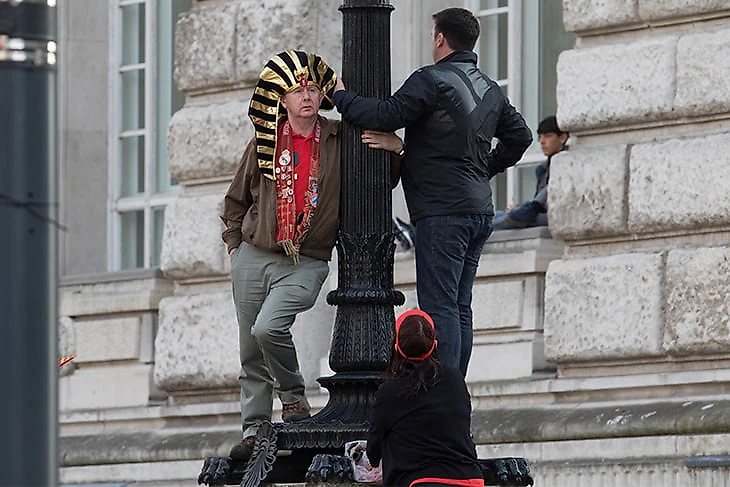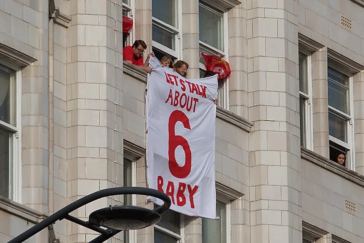 Через два с половиной часа после того, как автобус стартовал, полицейские на Стрэнде зашевелились. Болельщики воспряли, чувствуя, что команда близко: детей сажали на плечи, на столбы карабкалось все больше молодежи, а из окна высотки выбросили плакат Let’s talk about six baby.