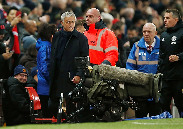 «Олд Траффорд» – один из немногих стадионов АПЛ, на котором игрокам приходится выходить от угла поля. Тренеры проделывают путь по самой кромке, в метре от первых рядов. Это тот самый момент, когда болельщики могли прицельно высказать Жозе то, что о нем думают: будь это аплодисменты или ругательства.