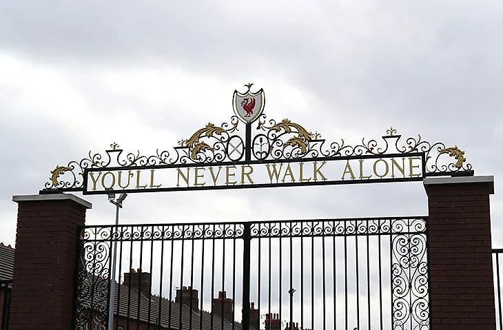 Anfield road по всей красе со знаменитыми воротами You’ll never walk alone.