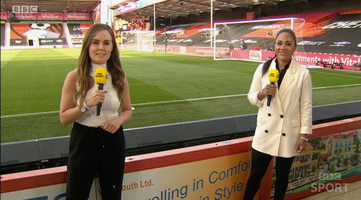 Первый в истории матч АПЛ BBC доверили своим топовым экспертам. В манчестерской студии Match of the Day перед игрой собралось традиционное трио: Гари Линекер, Иан Райт и Алан Ширер. Комментировали игру журналист Стив Уилсон и экс-футболист «Тоттенхэма» Джермейн Дженас, от кромки поля работали корреспондент Келли Саммерс и экс-футболистка «Арсенала», а теперь ведущая BBC Алекс Скотт.