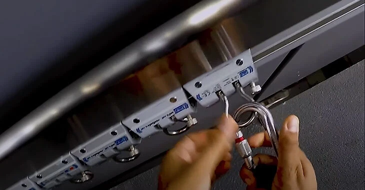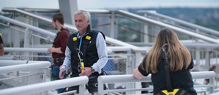 Дальше ждет 10-минутный ролик о процессе подъема, подробное описание снаряжения и инструкция по поведению наверху (традиционные не бегать, не прыгать, слушать гида). На экипирование уходит еще минут 15. Для подъема выдают специальные нескользящие ботинки, жилет или комбинезон в плохую погоду, альпинистские ремни с карабинами и наушник, чтобы слышать инструктора на высоте.