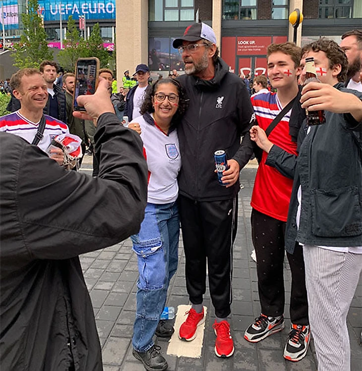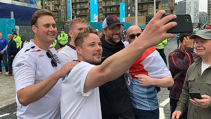 Здесь же внезапно нашелся двойник Юргена Клоппа. Cheeky Jurgen – «Дерзкий Юрген» – обычно ездит за «Ливерпулем», но такой матч пропустить не мог. «Мой мозг за Англию, а вот серррррдце – за Германию, конечно», – прорычал он и продолжил охотно фотографироваться с болельщиками.