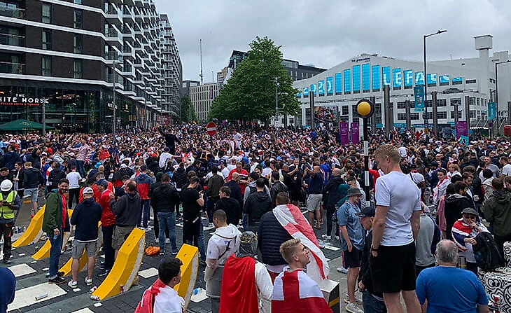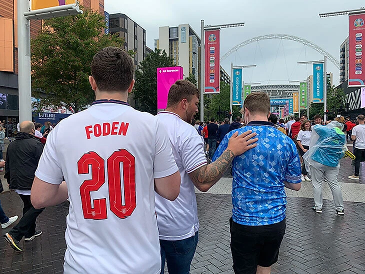 Англичане действительно захлебывались ощущением домашнего турнира: в случае, если Англия дойдет до финала, лишь один матч (четвертьфинал) она проведет вне «Уэмбли». Фанаты – а их на матчи плей-офф пустили почти 45 тысяч – облюбовали не только променад по дороге от метро и близлежащие переулки, но и большую площадь сбоку от стадиона.