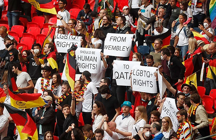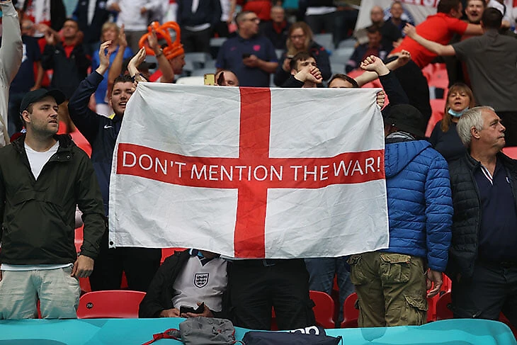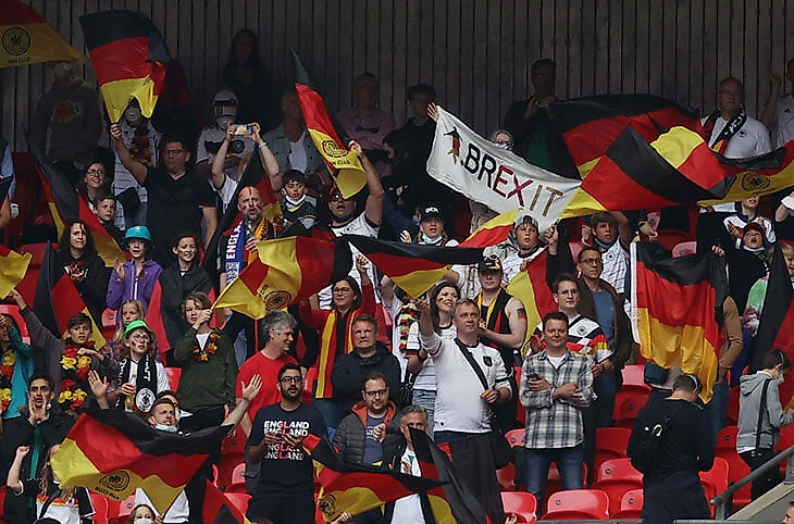На матчи вернулся небольшой духовой оркестр, поддерживающий сборную Англии на всех матчах, так что большая часть игры прошла под их бодрое дудение национального гимна и It’s coming home. Немцы же привезли с собой пару барабанов и сотню флагов, так что в углу стадиона бесконечно мельтешили черно-красно-желтыми полотнами. Они же растягивали многочисленные плакаты: от ироничного Brexit с намеком на вылет Англии с Евро до посылов с поддержкой прав сексуальных меньшинств.