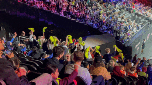 Почти половину мест на трибунах заняли школьные группы, так что перерыв между тренировками сборных Европы и мира был занят детским визгом и побегами за камерами, выхватывающими детей на секторах.