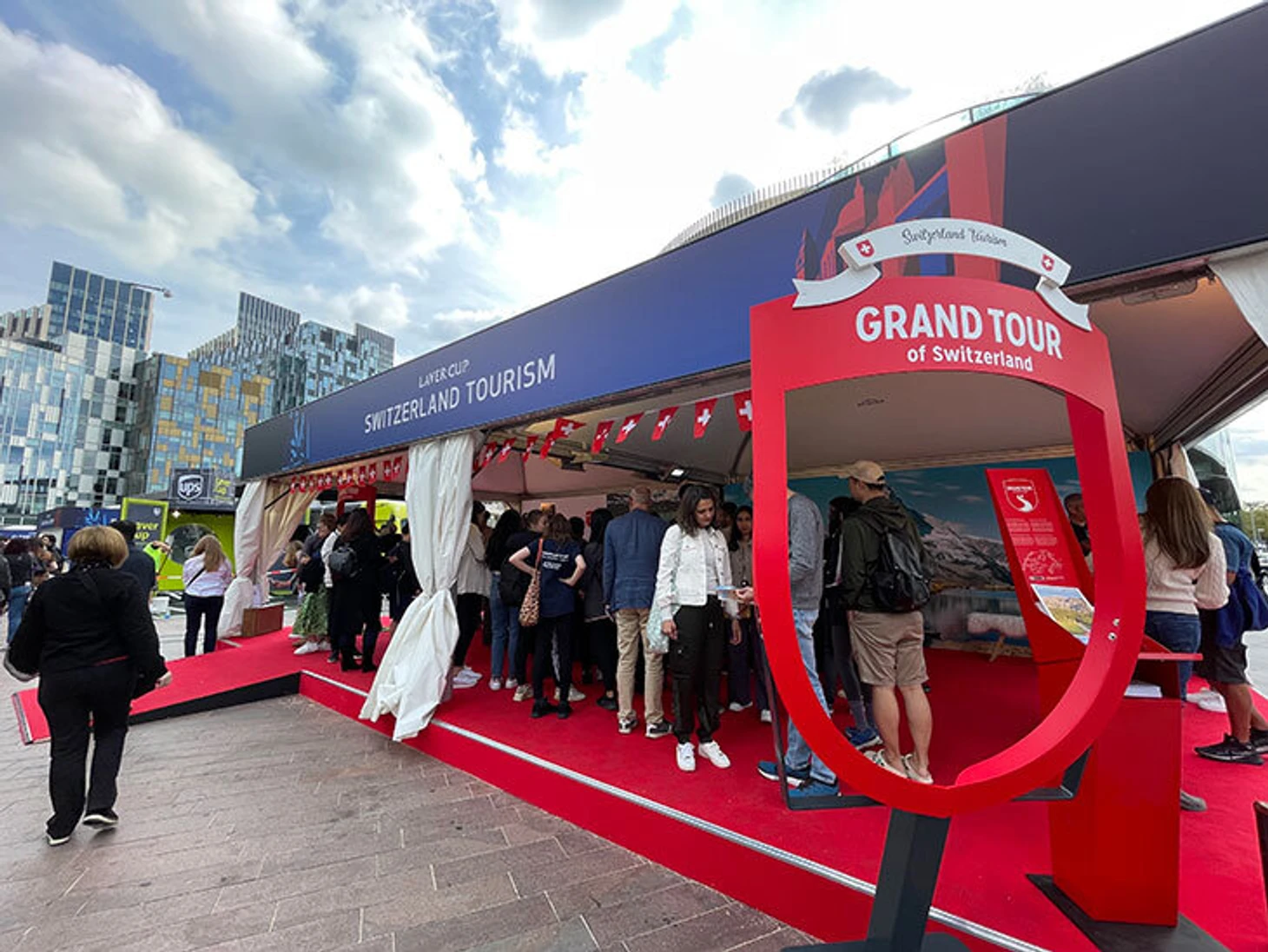 Многие болельщики пришли со своими плакатами, кепками RF и, конечно, швейцарскими флагами.