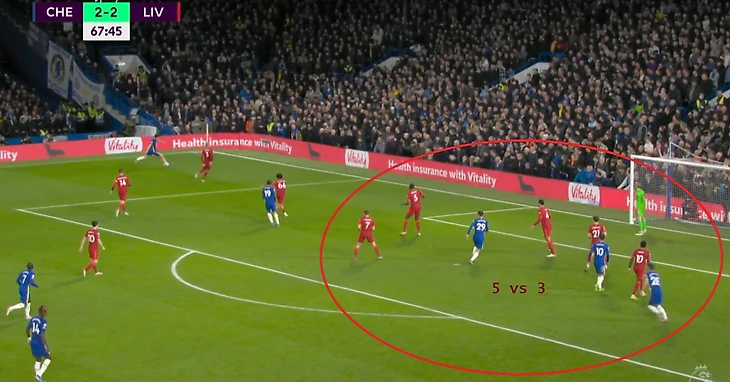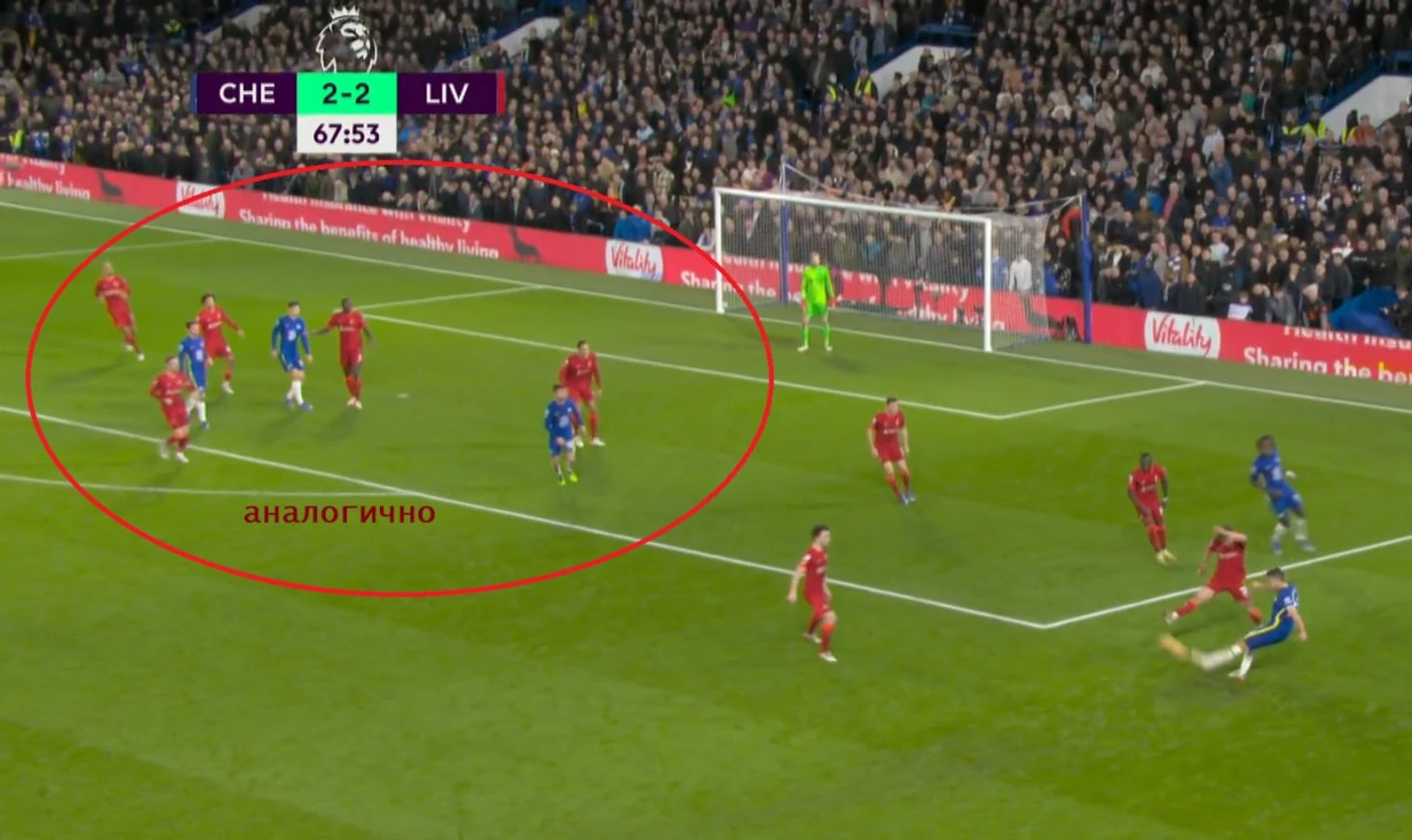 Не очень была понятна мысль «Челси» в концовке матча играть в навесы: в основном навесы шли на Пулишича, Маунта, иногда на Хавертца (разные конфигурации, но игроков было не больше трех; странно, что не на Канте :)), которые противостояли пятерым, а то и шестерым игрокам Ливерпуля. Да, однажды такой навес привез к явному голевому моменту Пулишича на 61 минуте, но ведь «синие» не думали всерьез победить в верховых дуэлях Ван Дейка, Фабиньо или Конате?
