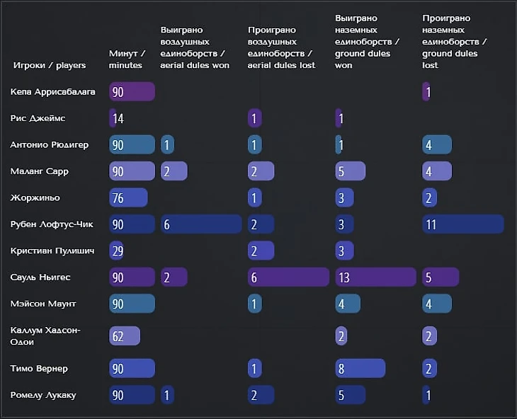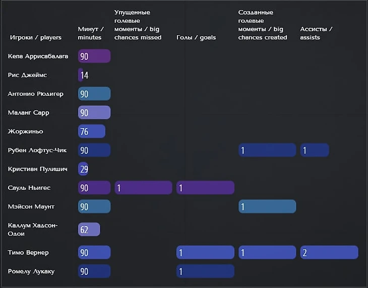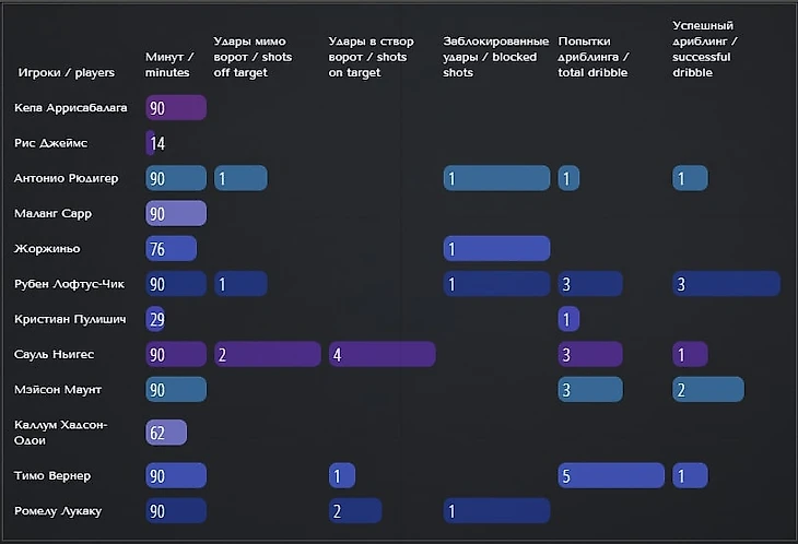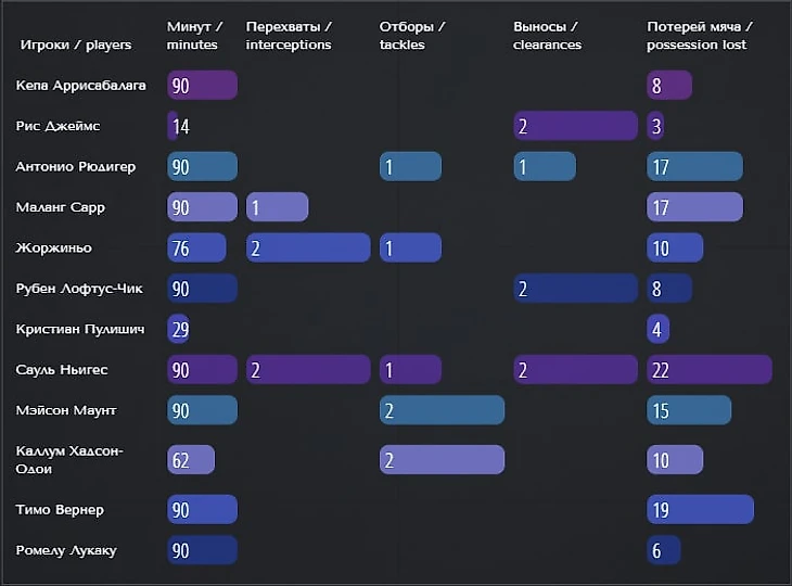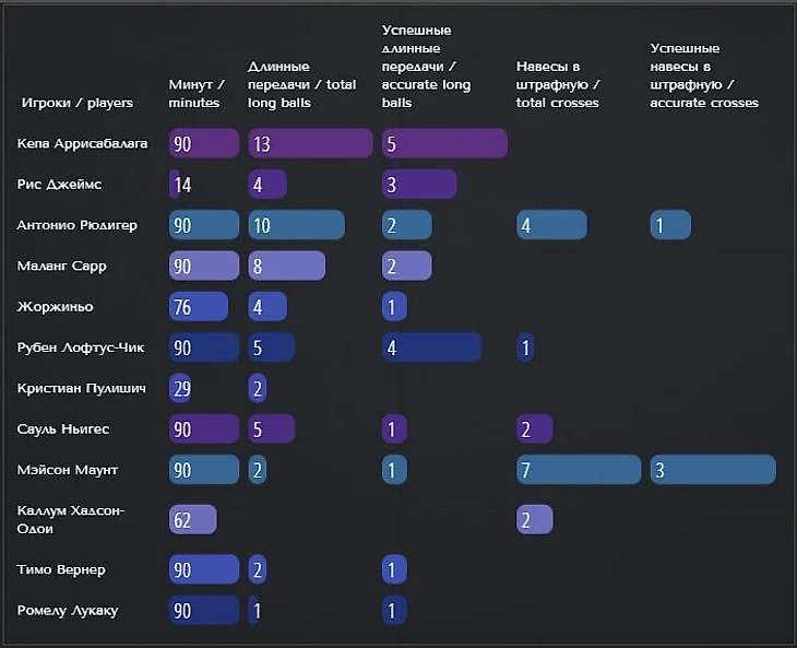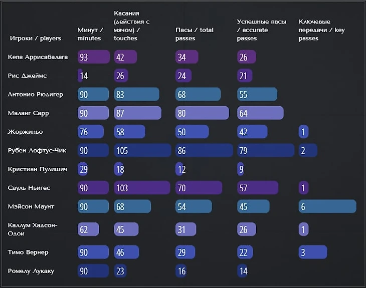 Лофтус-Чик весь матч играл так, будто находился под водой в железном гидрокостюме. Периодически зажигал в обводках, а потом возвращался на свой уровень. Количество пасов обусловлено его позицией.