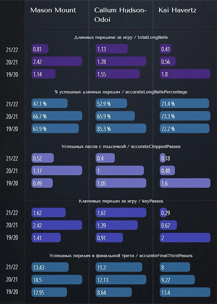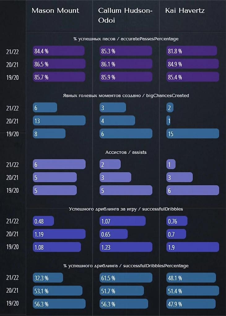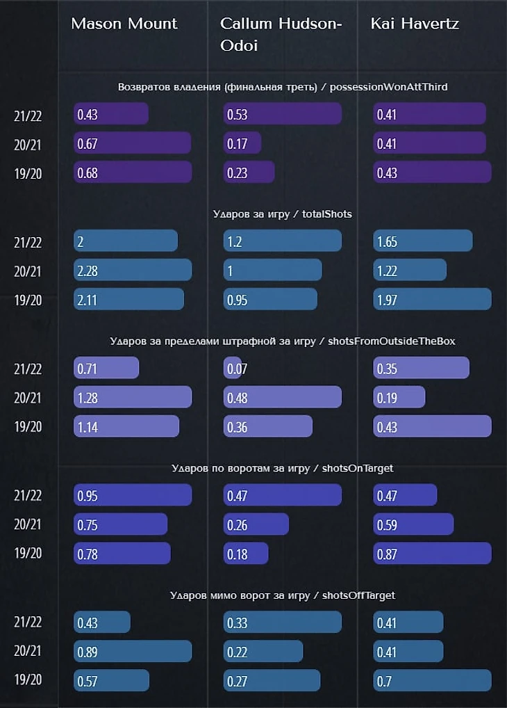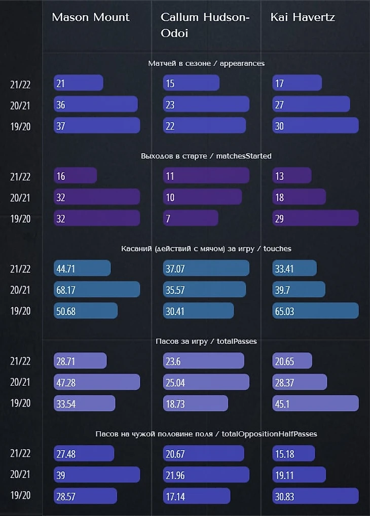 Мы уже рассмотрели недовольных игроков атаки «Челси» и сделали определенные выводы. Предлагаю обратить наш взор на других атакующих футболистов, а именно: на Маунта, Хадсона-Одои и Хавертца.