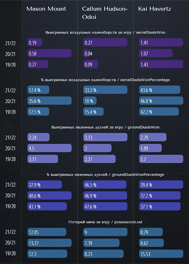 Немного вводных данных для показателей борьбы «на втором этаже»: рост Маунта составляет 178 см, Хадсона-Одои – 177 см, а Хавертца – 188 см. То есть реально «спрашивать» за проигранный верх мы можем только Кая.