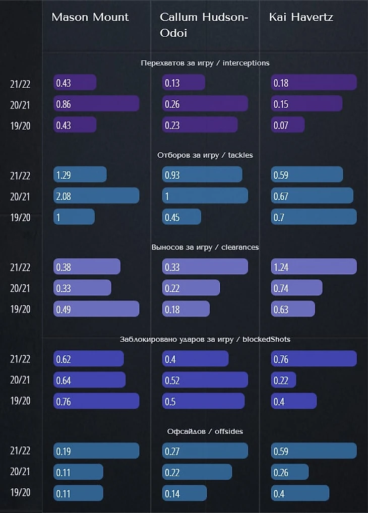 Хадсон-Одои и Хавертц тоже не блистают в аспектах перехватов и отборов, зато у обоих увеличилось количество выносов.