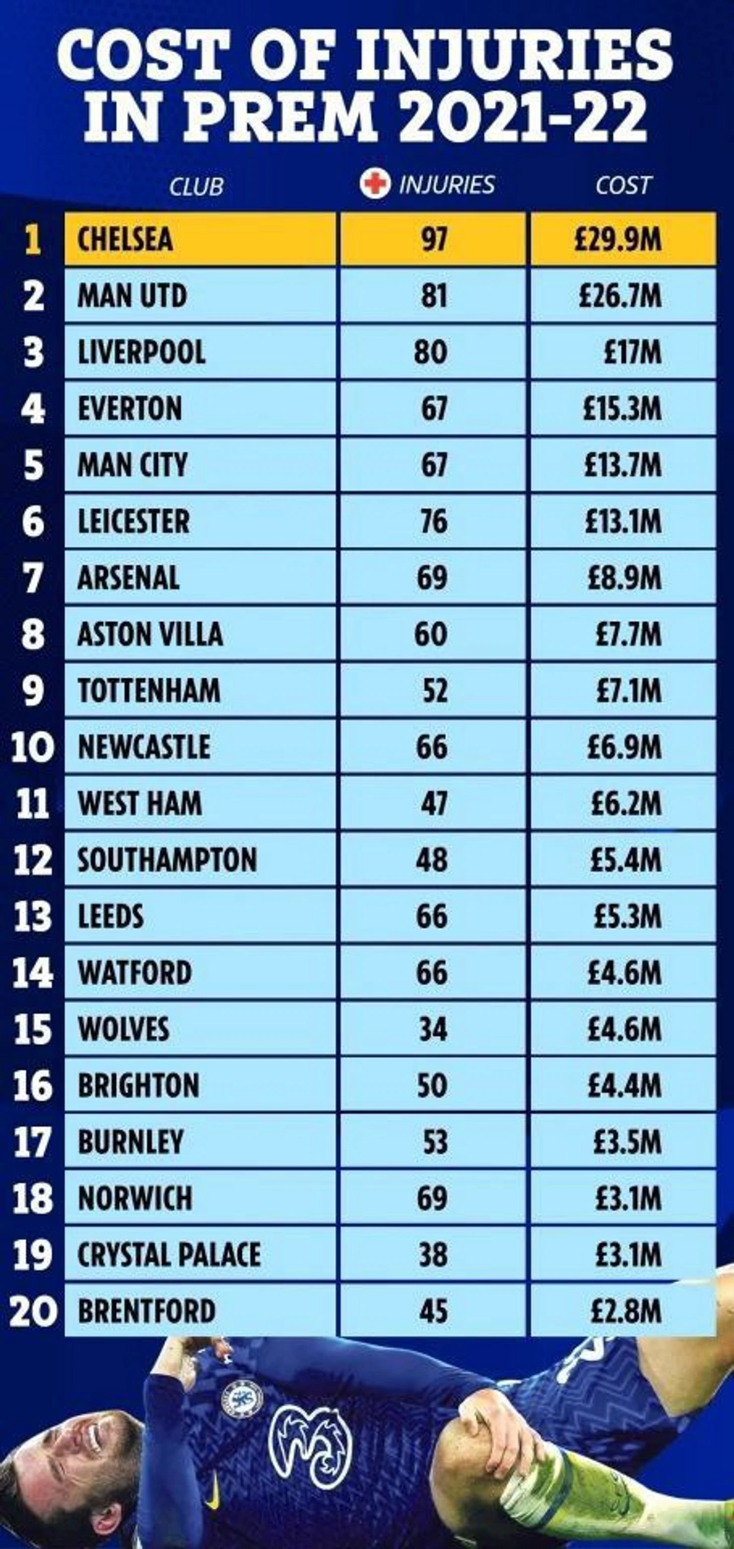 В этом сезоне эпидемия травм достигла своей эпопеи. Подробнее об этом можно почитать в материале Кирилла Бельского, где описывается, как одновременно в лазарете «Челси» находилось от 9 до 11 (sic!) человек.