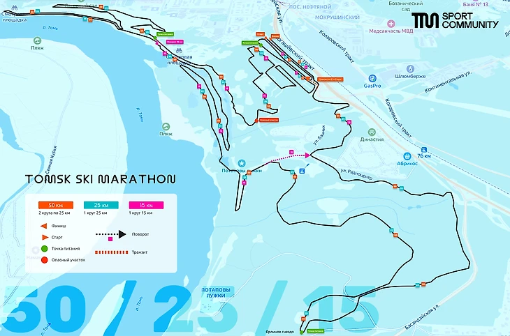 Старт включает четыре основных дистанции – 50 км, 25 км, 15 км и 3 км. Трасса проложена в один круг в 25 км, то есть марафонцам нужно будет преодолеть два круга, полумарафонцам – один.