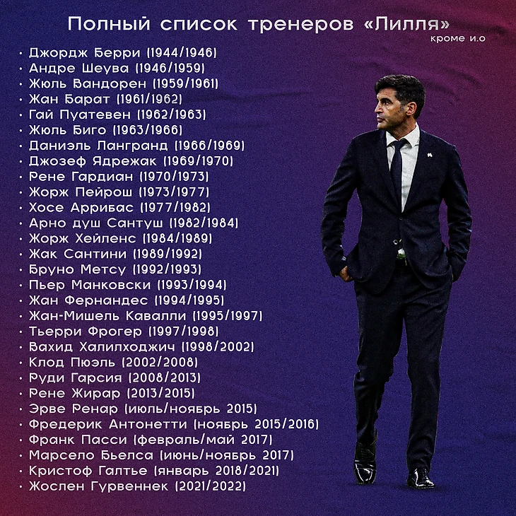 31 тренер в истории «Лилля» Не считая нескольких тренеров, временно исполняющих свои обязанности, Паулу Фонсека может стать 31 тренером основной команды. Вот полный список: