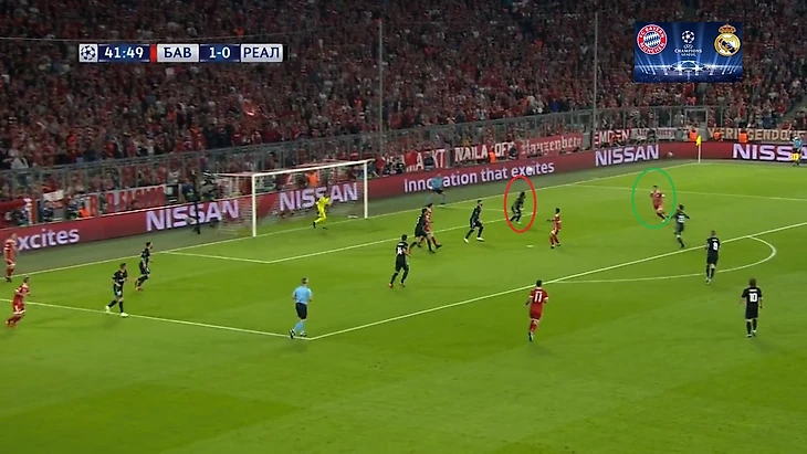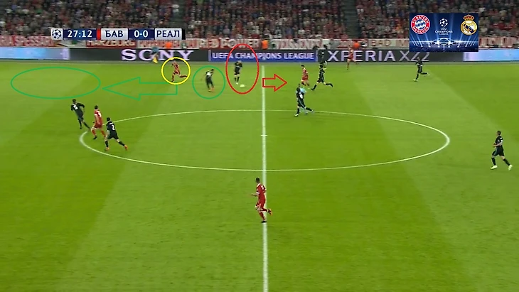Что делал в этом моменте бразилец? Рядом с ним был Кроос, который выходил на Хамеса и пытался помешать тому выполнить передачу. Вместо этого, Карлос просто остался в полупозиции и дал пройти передачи на Киммиха.