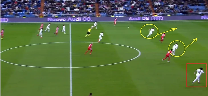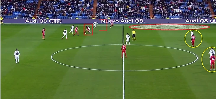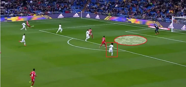 Затем, из-за большого провала на правом фланге, Начо бросает своего игрока и бежит страховать Одриосолу/Васкеса. Рамос в этот момент смещается ближе к правому флангу, к игроку, которого бросил Начо. Марсело бежит в оборону.