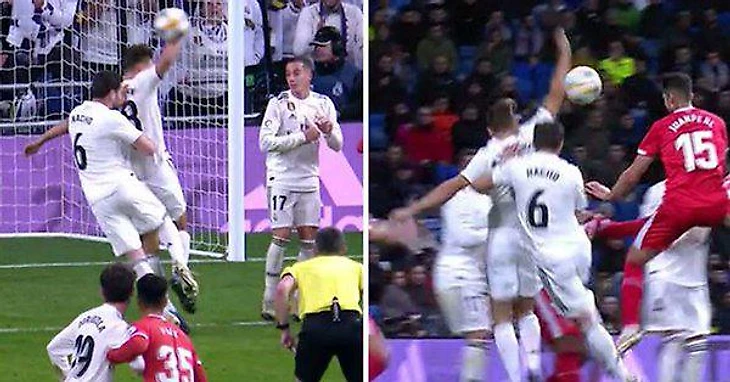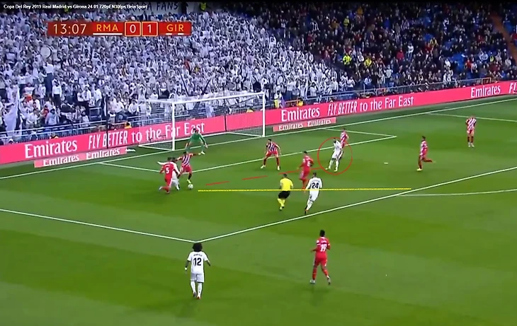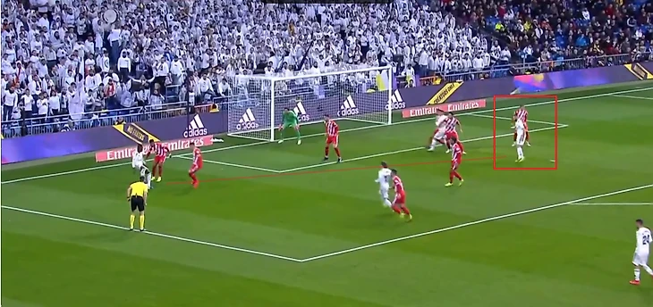Одриосола пошел в отбор на чужой половине поля, оставив свою зону. Его должен был страховать Лукас, который этого не сделал. Он не только не подстраховал одноклубника, но и своего игрока упустил (Рауля Гарсию). Начо и Рамос держат двух нападающих, все как положено. Марсело стоит на фланге и контролирует правого вингера Жироны (его в кадре нет).