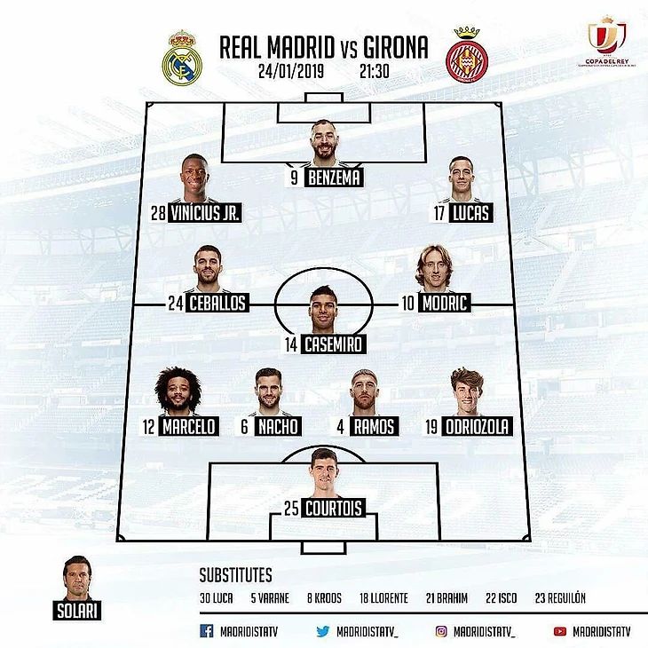 Солари не стал идти по пути Вальверде, и не выпустил резервный состав на матч Кубка. Единственные основные игроки, которым дал отдохнуть аргентинец, - Карвахаль и Варан. Правда выход Одриосолы вместо Дани не мог никого удивить, так как в Кубке Короля Альваро сыграл во всех матчах и является основным правым латералем команды.